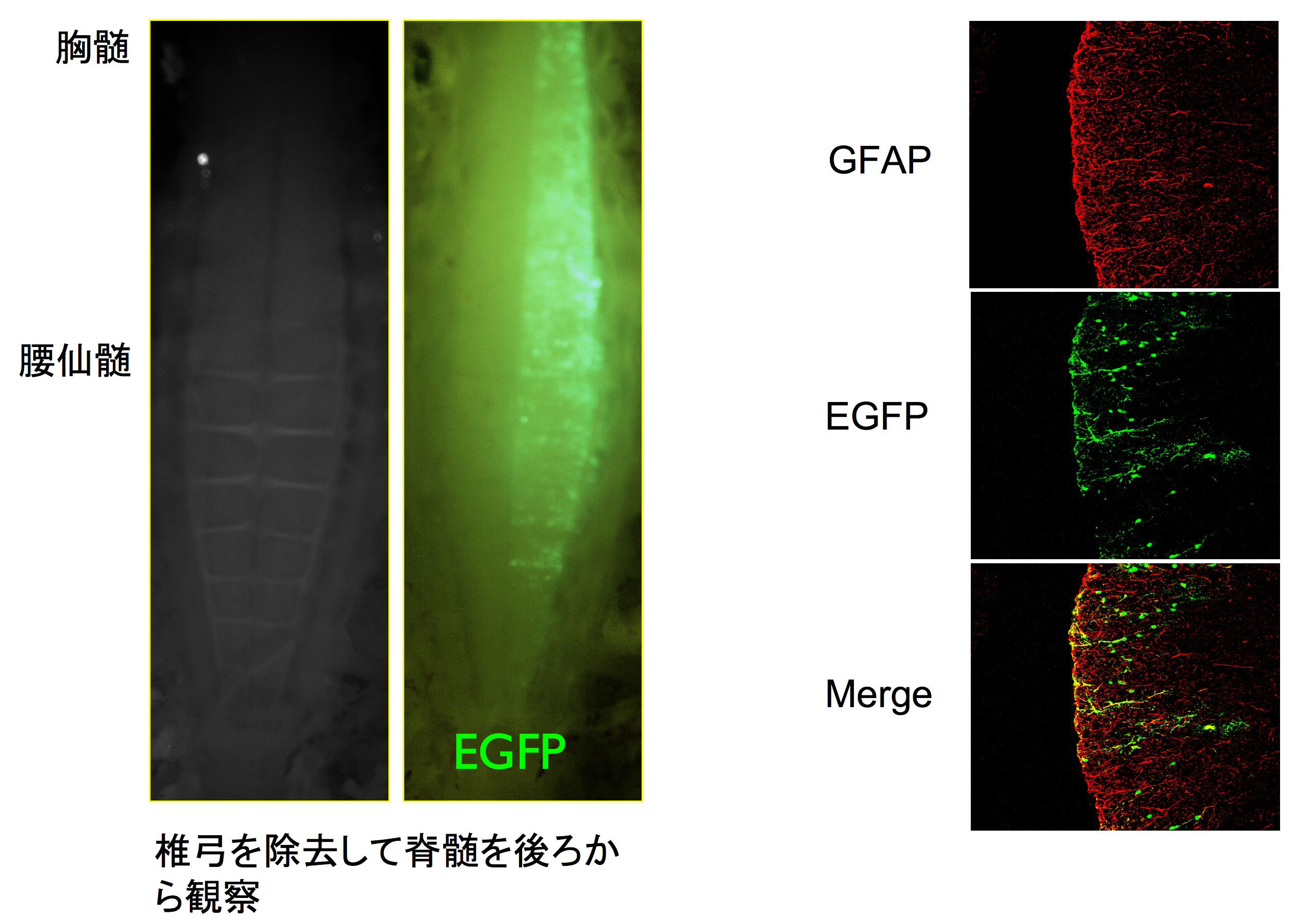 すでに予備的な試みとして生体エレクトロポレーション法にてTol2 トランスポゾン及びGFAPプロモーターを有するコンストラクトを早期 胚に導入することで、発生後期に発達分化するグリア細胞の一つ であるアストログリアに遺伝子導入することに成功しました。 (Shibata et al. in preparation)