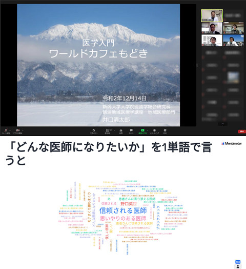 当講座担当授業の中で毎年開催してきた医学入門「ワールドカフェ」ですが、今年もコロナ禍の中、Zoomを用いて何とか実施することができました。 冬に向かって厳しさを増すコロナ禍の影響でこれまでの様に、一年生が一堂に会して、ワールドカフェを実施することはできませんでした。しかし講師陣は昨年と同様に瀬尾さん(瀬尾医療連携事務所)、斎川さん(新潟市医師会地域医療推進室)、吉嶺先生(新潟県立十日町病院院長)、今西先生(当講座)と井口で担当させてもらいました。