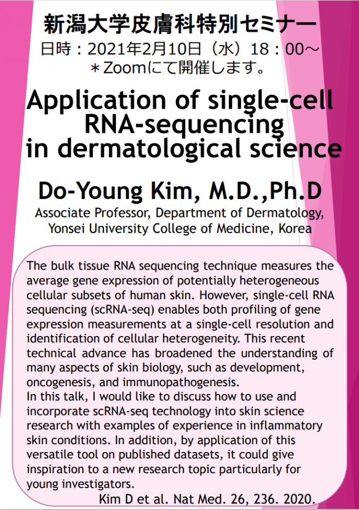 2月10日、Do-Young Kim先生(Associate Professor, Department of Dermatology, Yonsei University College of Medicine, Korea)のWeb特別セミナーを予定しております。是非ご参加ください。 2021年2月10日Do-Young Kim先生Web特別講演ポスター