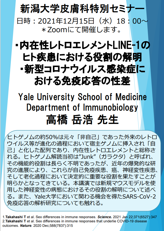 12月15日(水)、高橋岳浩先生(Department of Immunobiology, Yale University School of Medicine)の特別セミナーを予定しております。 是非ご参加ください。