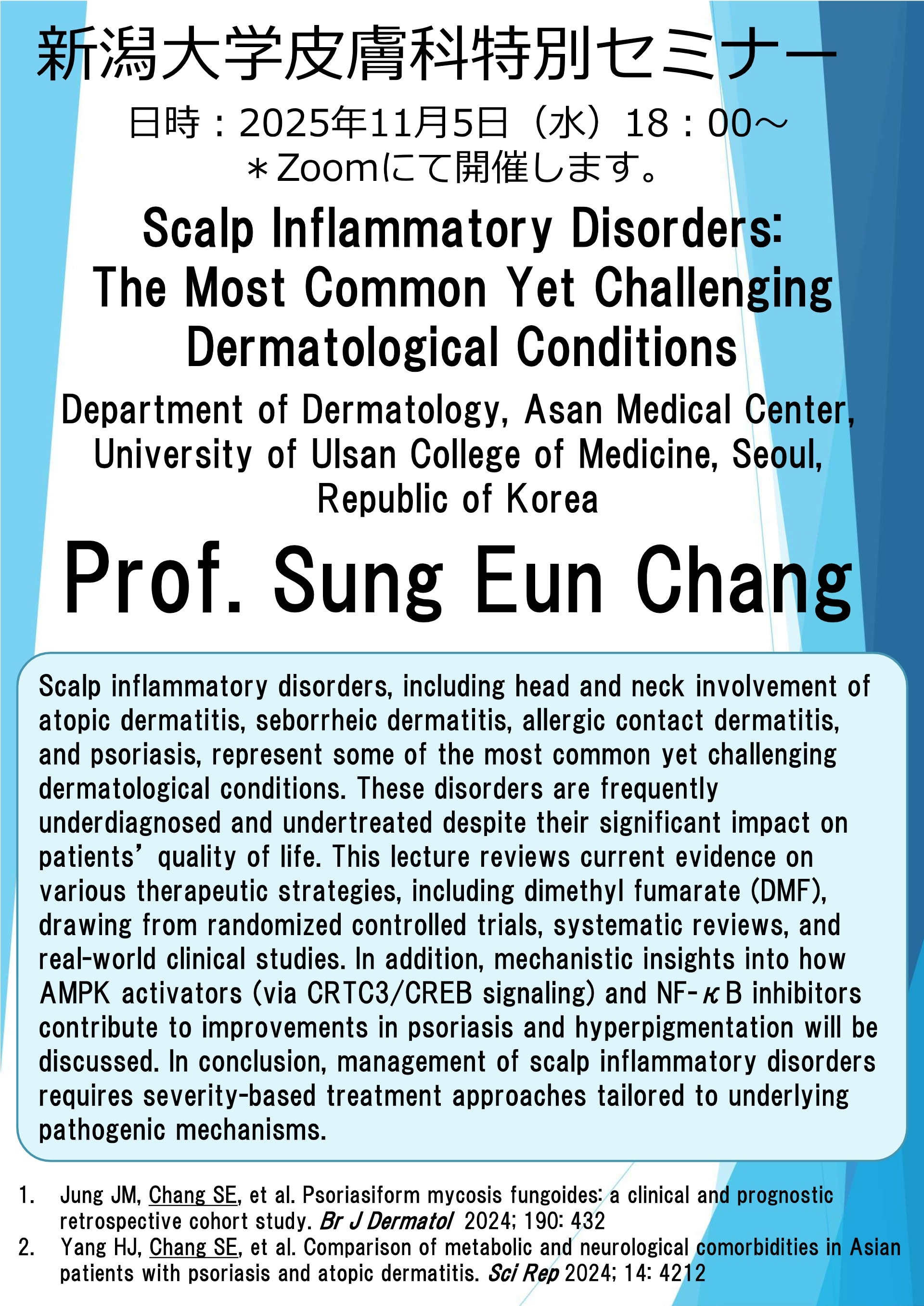 2025年 11月 5日、Dr. Sung Eun Chang(University of Ulsan College of Medicine, Korea) 「 Scalp Inflammatory Disorders: The Most Common Yet Challenging Dermatological Conditions」 のWeb特別講演を予定しております。 ぜひご参加ください。