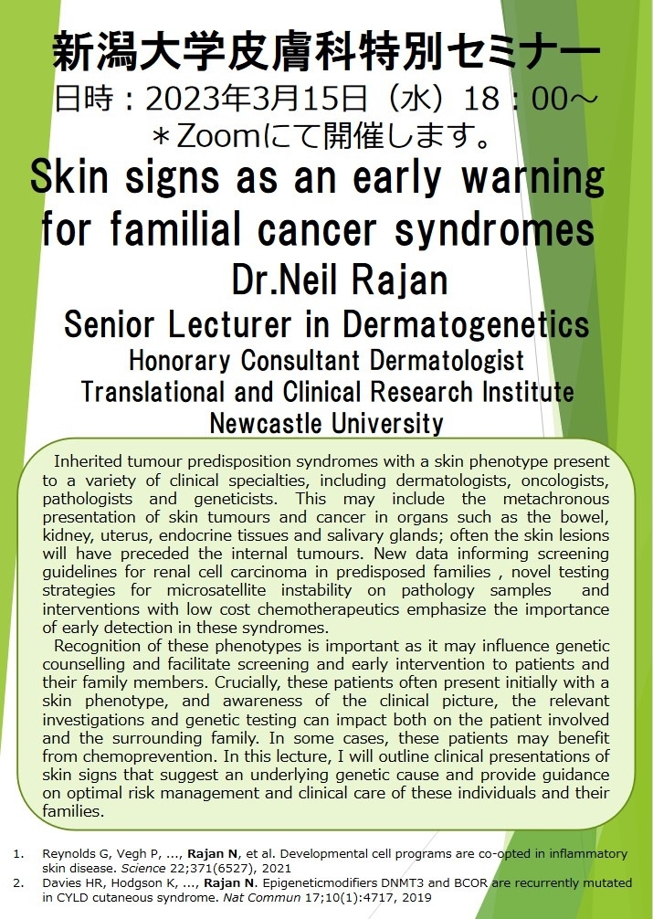 Web特別講演 Neil Rajan先生(Senior Lecturer, Dermatogenetics Honorary Consultant Dermatologist Translational and Clinical Research Institute Newcastle University)