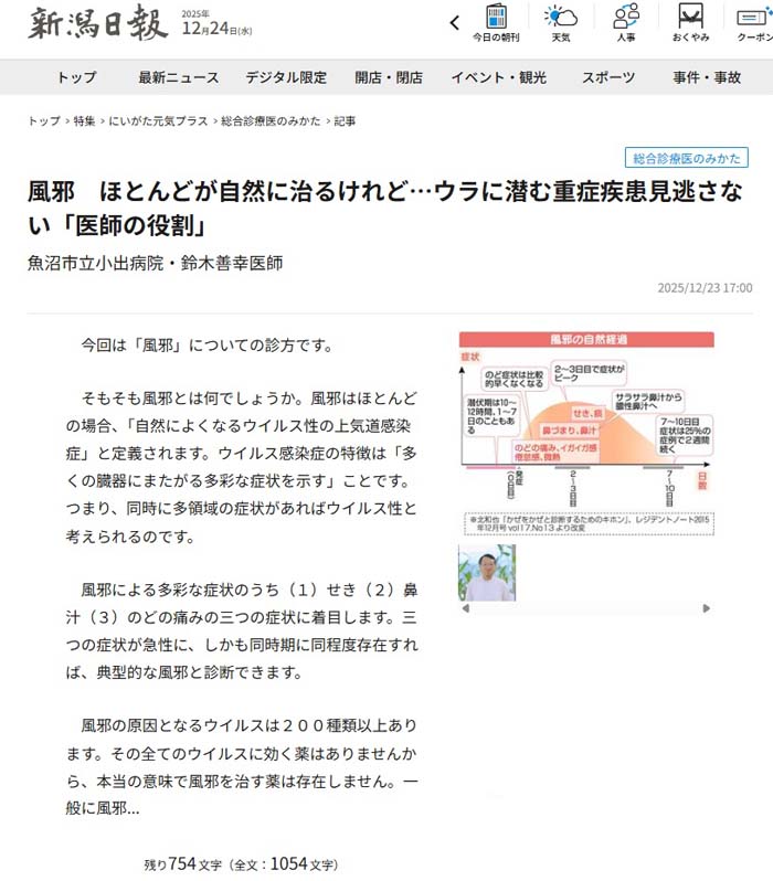 魚沼市立小出病院・鈴木善幸先生の【風邪 ほとんどが自然に治るけれど…ウラに潜む重症疾患見逃さない「医師の役割」】が掲載されました!