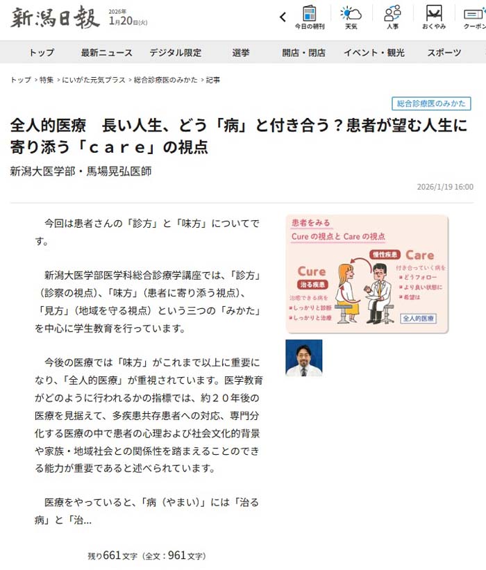 新潟大学医学部・馬場晃弘先生の【全人的医療 長い人生、どう「病」と付き合う?患者が望む人生に寄り添う「care」の視点】が掲載されました!