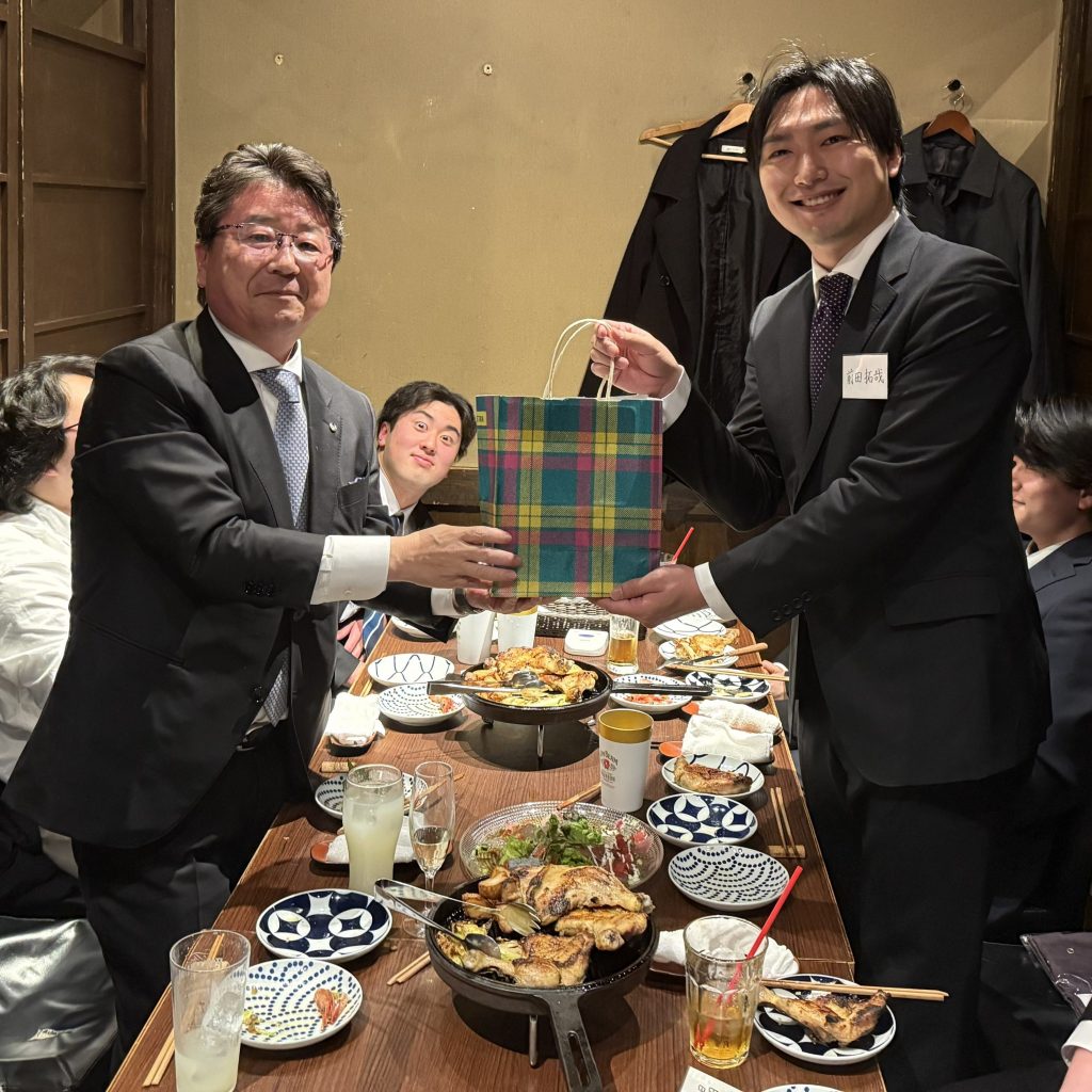 懇話会45班の追いコンが開催されました。寺本君、山田君、吉田さんの卒業を祝い、記念品が贈られました。