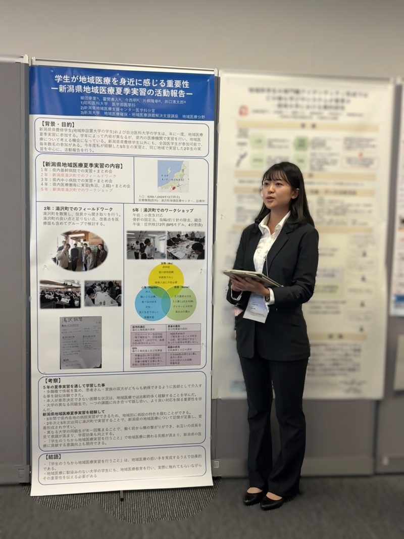 令和7年10月11日朱鷺メッセにて第4回日本地域医療学会が開催されました。学生ポスター発表のブースに、昭和医科大学5年細田幸里さんが参加し、「学生が地域医療を身近に感じる重要性~新潟県地域医療夏季実習の活動報告」の題目で、主に2年生と5年生で参加した湯沢での実習について発表しました。これまで参加してきた夏季実習についてまとめと考察を行い、5年間の集大成となりました。