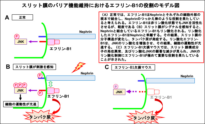 本研究は、スリット膜のバリア機能維持におけるエフリン-B1の役割を解明し、タンパク尿発症の新たな分子機構を明らかにしました。エフリン-B1の発現低下の抑制、リン酸化抑制、JNK活性を制御する薬剤、化合物がタンパク尿治療薬として有効である可能性を示しました。今後、既存の薬剤、新規化合物での検討を行い、タンパク尿の新規治療薬の開発を目指します。