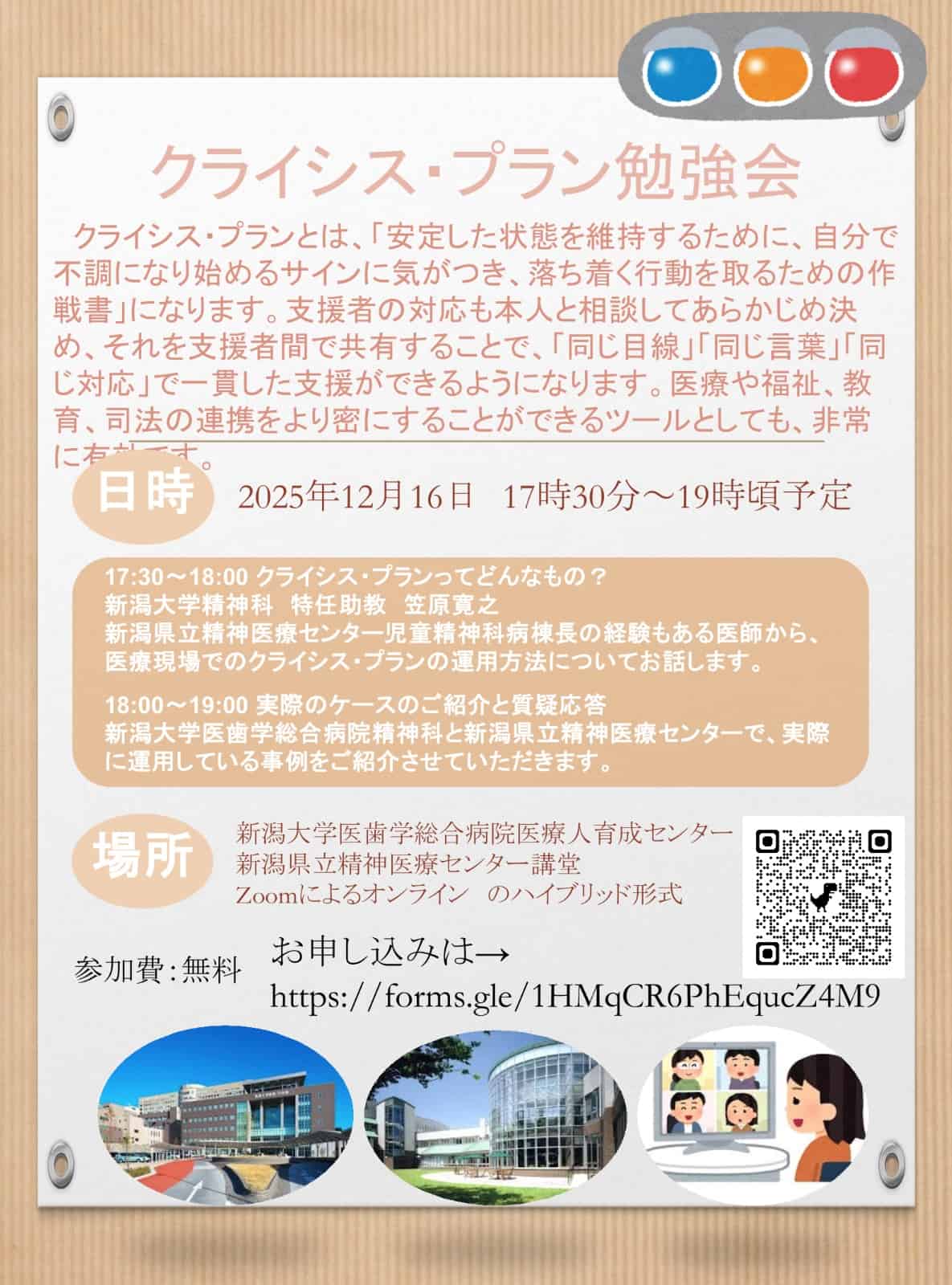 本勉強会では、基本的な考え方から実際の運用事例まで幅広く紹介し、医療・福祉・教育の現場でどのように役立つのかを学びます。クライシス・プランを初めて知る方にも、現場で導入を検討している方にもおすすめの内容です。