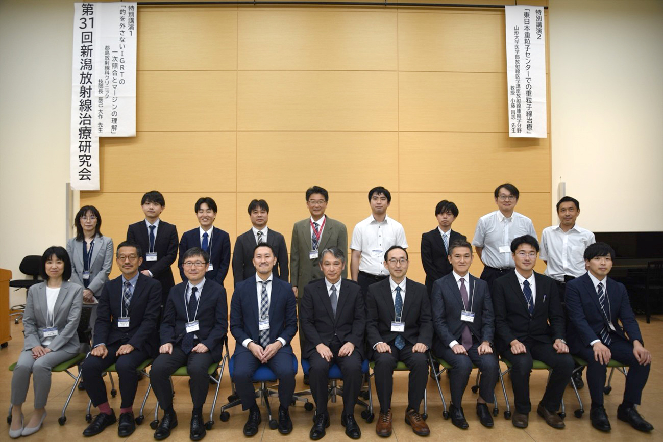 2025年9月27日、新潟大学医学部大講義室にて第31回新潟放射線治療研究会が開催されました。本研究会は、医師、診療放射線技師、看護師、医学物理士など、放射線治療に携わる多職種が一堂に会し、日々の臨床経験や研究成果を共有する場として継続的に開催されています。各職種からの一般研究発表に加えて、最新技術や製品に関するメーカープレゼンテーション、新潟大学病院の取り組みを紹介する施設発表、さらに外部講師による特別講演など、非常に充実した内容となりました。一般研究発表では魚沼基幹病院、長岡中央綜合病院、新潟大学病院など、県内各施設の医学物理グループからも発表が行われ、臨床現場での課題や工夫、研究成果が活発に議論されました。多職種が垣根を越えて意見交換を行う姿が印象的で、放射線治療の質向上に向けた意識の高さが感じられるセッションとなりました。特別講演では、都島放射線科クリニックの辰己大作先生より、放射線治療における位置照合の精度やマージン設定の考え方について実践的なご講演をいただき、参加者から大変好評を博しました。続いて、山形大学医学部放射線医学講座の小藤昌志先生より、東日本重粒子センターでの重粒子線治療の最新状況や今後の展望についてご紹介いただき、先進的な放射線治療の可能性を感じる貴重な機会となりました。 集合写真 |