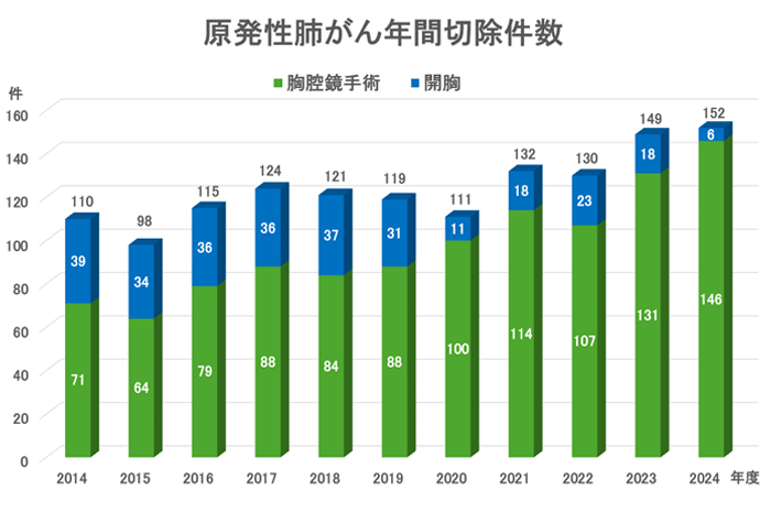 呼吸器外科では「原発性肺がん」「転移性肺腫瘍」「縦隔腫瘍」「気胸」「小児呼吸器疾患」など幅広い分野の疾患に4人の専門医が対応しています。手術件数は2024年度218件と県内でもトップクラスを誇っています。迅速かつ正確な診断に基づいて、診断、治療の専門家(呼吸器内科・腫瘍内科・放射線診断科・放射線治療科・病理部)によるカンファランス(キャンサーボード)を踏まえ、常に最新・最適かつ安全な治療を提供するよう努めています。
